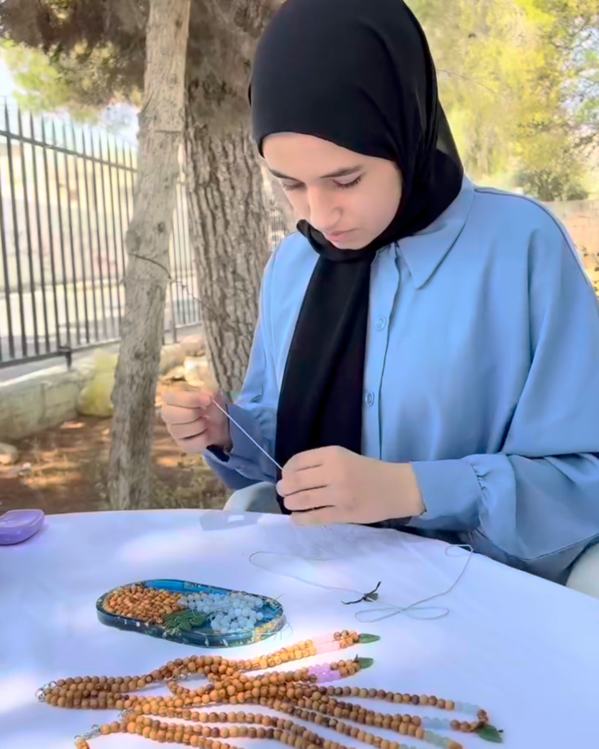 These necklaces are made from olive wood sourced and carved by artisans in Bethlehem. Each piece is designed and assembled by Mayar, a talented 15-year-old from the Husn refugee camp in Jordan. For every necklace sold, an olive tree is planted in her homeland, Palestine.